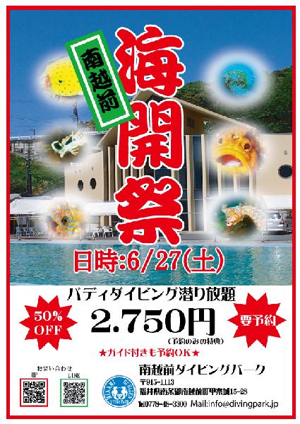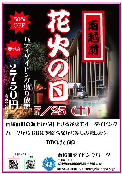 イベント紹介6/27(土) 海開祭 お得にダイビングしましょう。 全メニュー50%OFF 予約限定です。7/25(土) 花火の日 バデイダイビング・ファンダイビング50%OFF 夜には花火を見ながらBBQで楽しめます。予約限定です。